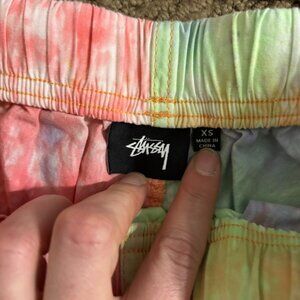 Vibrant tie dye cargo shorts with multiple pockets. Features a comfortable elastic waistband and adjustable belt. 26” waist (not stretched).