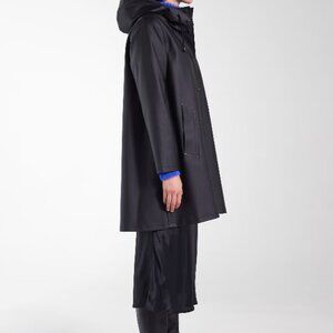 Mosebacke, a hilltop overlooking Stockholm and your top wardrobe staple, is an artisanally made a-line-shaped raincoat for women. The sturdy and hard-wearing waterproof fabric is tailored with double-welded seams, making it impossible for any moisture to seep through. Ease of movement and comfort is achieved with under-arm eyelets and a drawstring hood.