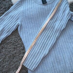 It's crafted from a fine blend of wool and angora, giving it a plush, gentle feel against the skin. The ribbed knit texture is classic and flattering, while the light blue shade is versatile and beautiful.