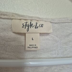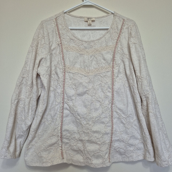 Tags: Style & Co top, beige lace shirt, boho long sleeve top, textured knit blouse, cotton blend top, women’s large, neutral everyday top
