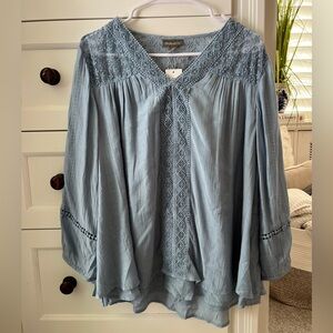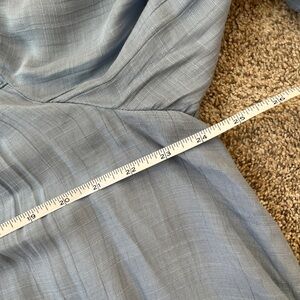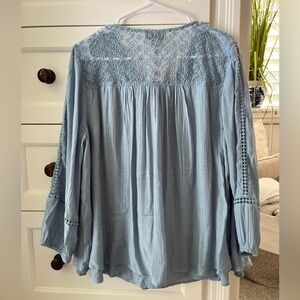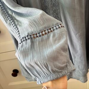 This light blue blouse features a V-neckline and billowy bishop sleeves, creating a relaxed and feminine silhouette.