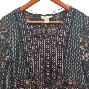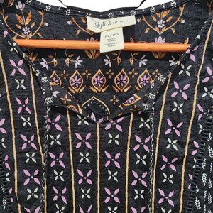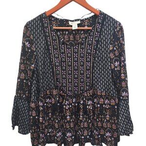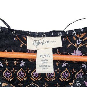Style & Co Petite Boho Peasant Blouse Black Floral Bell Sleeve Size PL Nylon Top