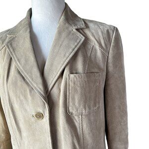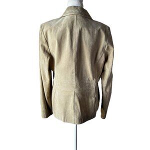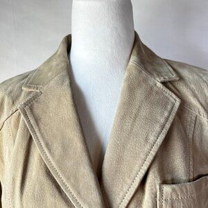 This genuine suede blazer features a beautiful tan/beige color, making it a versatile and trendy piece for the season. The structured fit, defined waistline, and tailored details offer a professional and sophisticated silhouette, perfect for the office or elevating a casual look.
