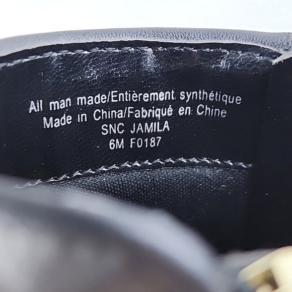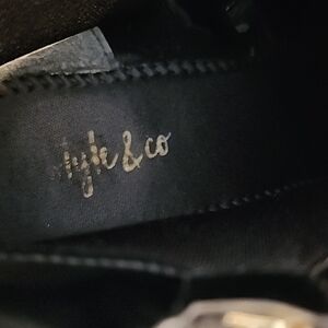 Excellent pre-owned condition, Style & Co women's black faux leather ankle boot with a 2.5" heel, an ornamental gold-tone side zipper on the outside of the boots and functional side zip on the inside to easily take on and off, size 6M.