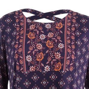 Style & Co Women's Printed Long Sleeves Top (XL, Colour - Santa Fe Grape). NWT. 100% nylon. Generous fit. Bell sleeve. Criss-cross detail at back of neck. Hits at hips. Ruffle hem. Allover print. Scoop neckline.