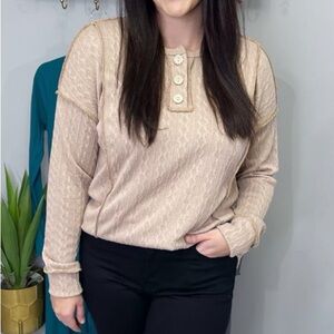 Textured henley top with a swoop hem, round neckline with functional buttons in a gorgeous beige colour.