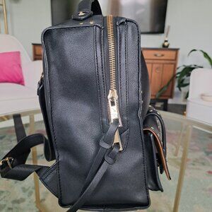 A sleek black vegan leather backpack adorned with gold studs for that perfect touch of edge and elegance. Inside, the faux suede golden brown interior cradles all your essentials, while multiple exterior and interior pockets keep everything organized.