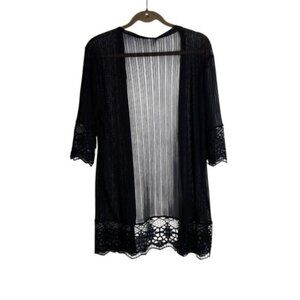 Trendy black lace cardigan coverup. Sheer. Ideal for layering. Get for a bathing suit coverup or jean shorts and a t-shirt.