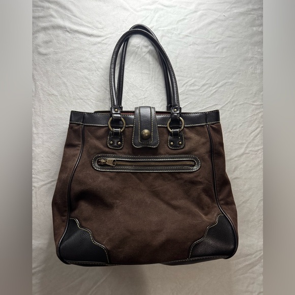 Trendy tote bag in black and brown. Features a convenient front pocket.