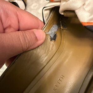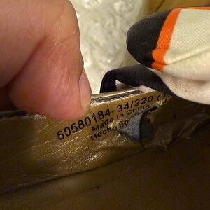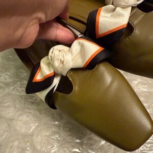 Trendy beige shoes with a striking black and orange bow design. Perfect for adding a pop of color to any outfit.