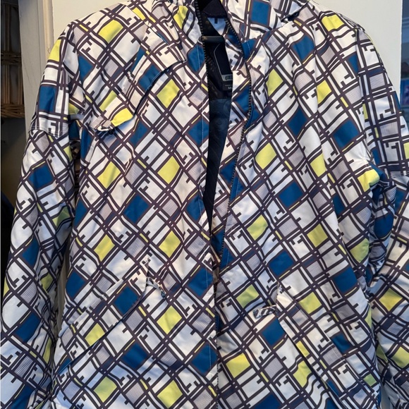 Elevate your style with this eye-catching geometric pattern jacket. Featuring a blend of blue, yellow, and white, this jacket is perfect for making a statement. Ideal for any casual outing.