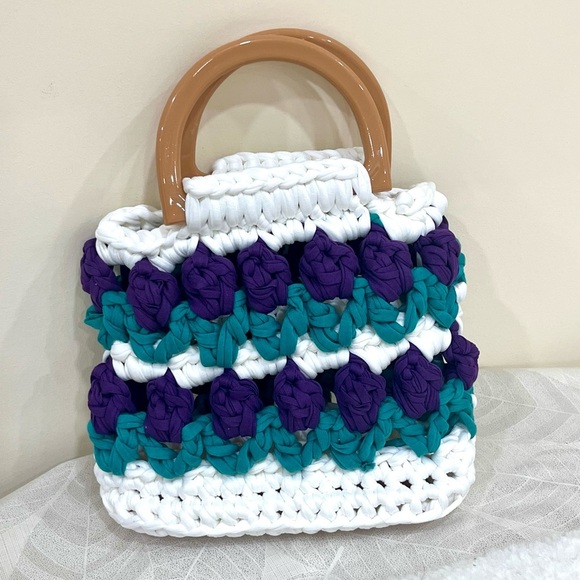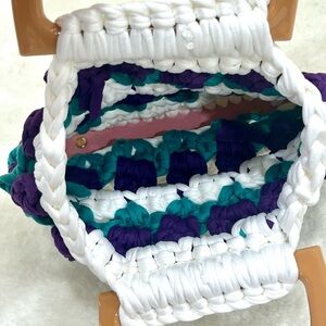 Beautiful hand-crocheted handbag made with Thick & Elastic T-Shirt Yarn. Features a unique textured pattern in white, teal, and purple, paired with sturdy rounded handles. Stylish, lightweight, and one-of-a-kind — perfect for daily use or adding a handmade touch to any outfit.