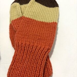 Chic knit mittens featuring a blend of brown, orange, and cream tones. Ideal for cozy warmth.