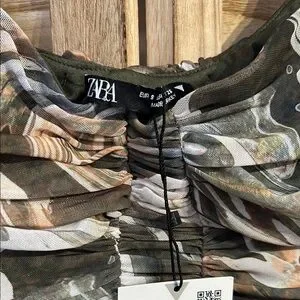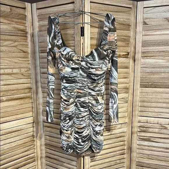 Elevate your wardrobe with this chic multicolor ruched dress. Perfect for any occasion, this dress features a unique pattern that stands out. The long sleeves and flattering fit make it a must-have addition to your collection. NWT.
