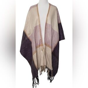 Chic poncho featuring a blend of purple, cream, and tan with fringe detailing.