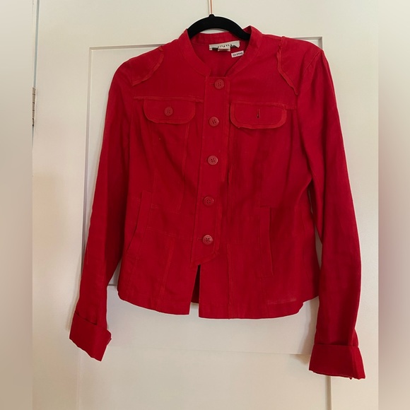 Elevate your wardrobe with this chic red linen jacket. Perfect for versatile styling and everyday wear.