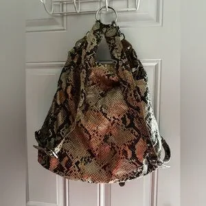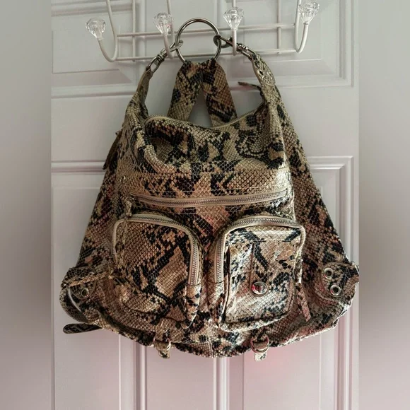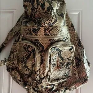 Elevate your style with this chic snake print backpack. Perfect for any occasion, this bag combines fashion and functionality. The unique design and neutral tones make it a versatile addition to your wardrobe. Has numerous exterior and interior pockets.