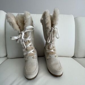 off white Stylish Suede tall winter boots with Faux Fur boot tongue, Faux Fur 3.5" inside upper edge and slight heal
