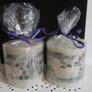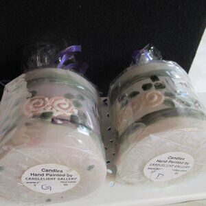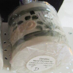 Stylized flowers dance around these mauve and taupe pillar candles for a full 3D experience. See other hand painted candles in my closet.