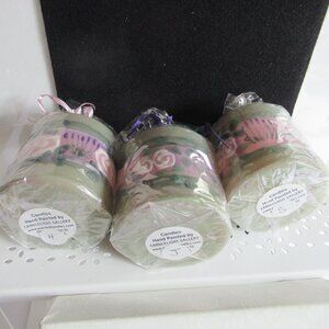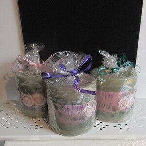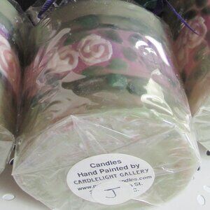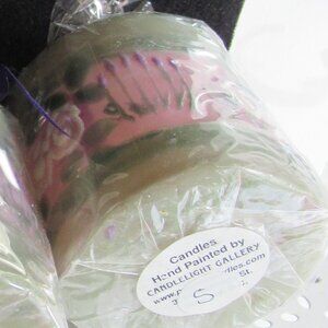 Stylized flowers dance around these green and pink or purple pillar candles for a full 3D experience. See other hand painted candles in my closet.