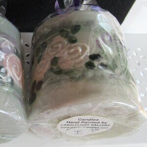 Stylized flowers dance around these green and pink or purple pillar candles for a full 3D experience. See other hand painted candles in my closet.