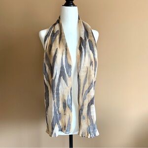 Vintage neck scarf in stylized tiger stripe pattern; grey, tan and cream tones.