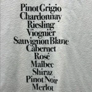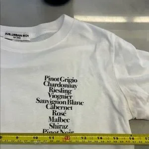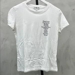 Classic white tee with boozy beverage list on the bust. Some staining to under arms, fair condition.