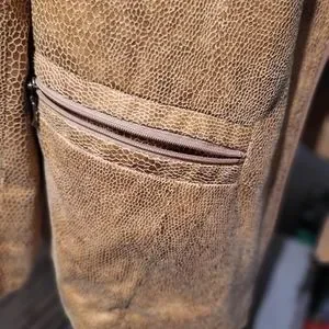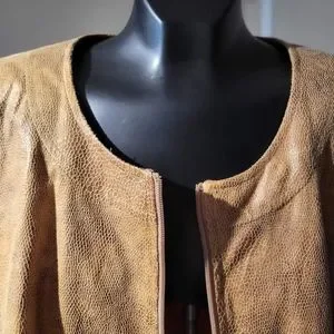 Sassy faux snakeprint, boxy tan jacket. Ring collar, zip front, zip slash pockets. Great lightweight one goes on over everything!