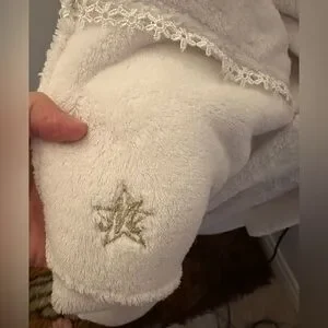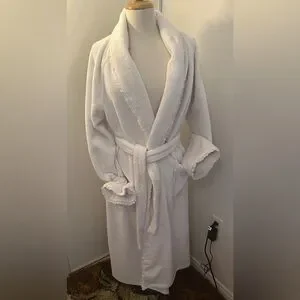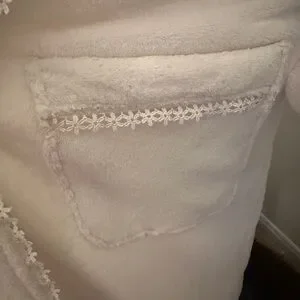 Elegant white robe with lace trim. Soft and comfortable. Perfect for lounging.