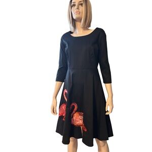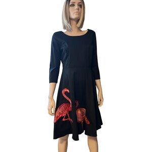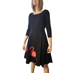 Sucrefas Dress Black ¾ Sleeve Vintage Inspired Flamingo appliqué Circle Skirt