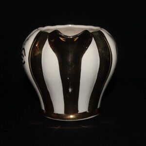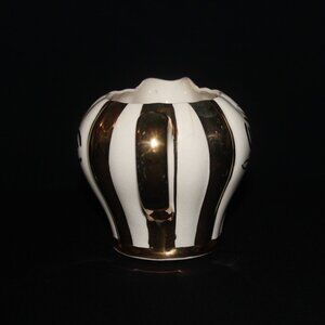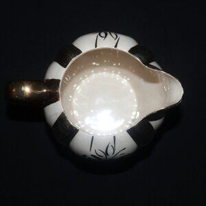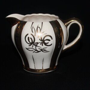 A lovely gold and ivory fluted creamer in the Rita pattern. Made by Sudlow Burslem in England, the creamer matches the Rita teapot in the last photo (sold separately). It holds 250ml or 8oz and is 3 1/2" tall and 5 1/2" length from spout to handle.