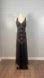 Features - V neck line, soft cups to bust line, beaded bodice with sequins, 13 gold beaded strands 19” long to each side of the dress, light and flowing skirt with 2 open slits 20” long to front and back, invisible zipper to left side of dress 13” long, spaghetti strap V to back of dress, fully lined, labelled size 10, style number N6312.