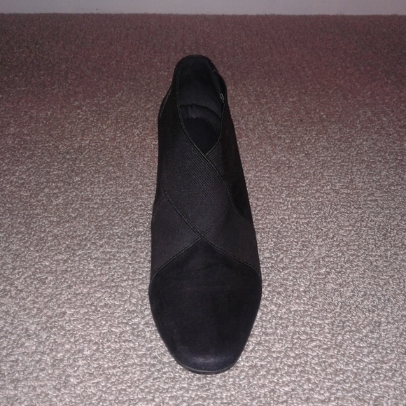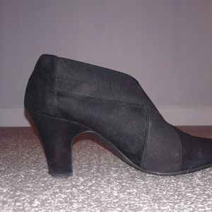 A pair of suede booties with a pointed toe and a 2 inch heel.
