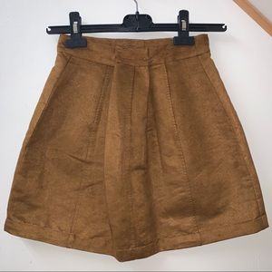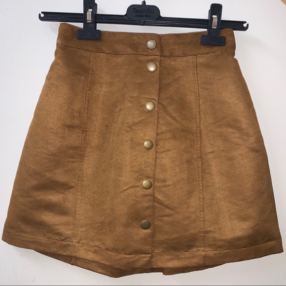 Old Navy suede button skirt. The mustard/brown colour is perfect for fall outfits. Used for a Halloween costume once, and there is an adjusted hemming at the back of the skirt that made it an inch tighter (around 28cm waist).