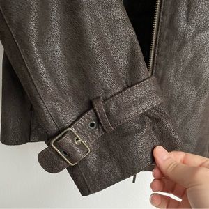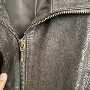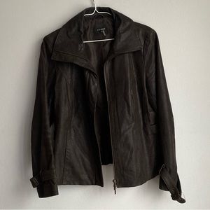 This is a dark brown suede jacket.
