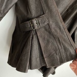 This jacket has two side pockets and adjustable strap details on the sleeves. It also has decorative adjustable straps on the sides.