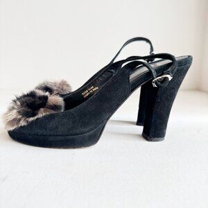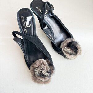 Suede Leather Fur Rosette Detail Peep toe Sling Back Heels 6.5