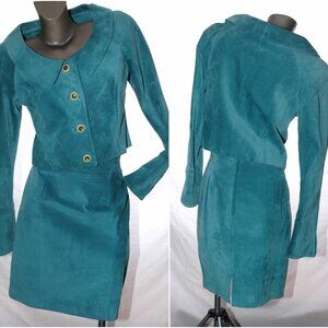 2 Pc. Set includes matching Suede Leather Jacket & Skirt...A beautiful set in Aqua / Teal Green color. Excellent gently used condition. No tears, holes, or stains - skirt waist does have some marking from hanger clips but this would likely be covered by blouse or jacket. (please refer to photo's as they are an important part of description).