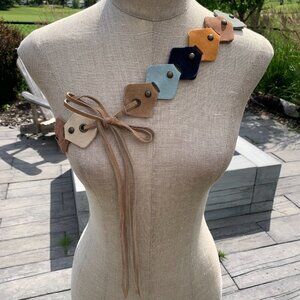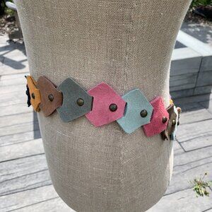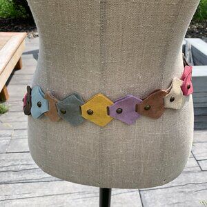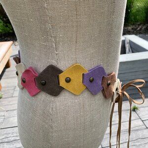 This suede leather tassel fringe front side tie hip low waist belt is a stylish accessory perfect for a bohemian, hippie festival look. The adjustable one-size belt features pastel multicolor with tasseled accents, fringe detail, and studded hardware. Made with high-quality leather suede materials, this medium-width belt is designed for a low waist fit. Ideal for women who love a hip belt style with a boho-chic festival, hippie, or cowgirl theme, this belt is a fashionable and versatile addition to any wardrobe.