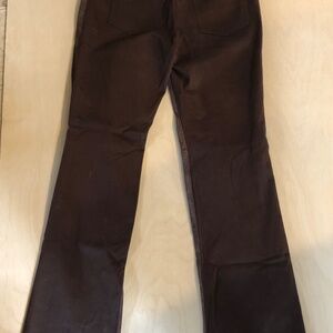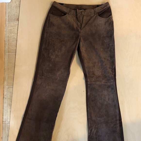 Dark brown genuine suede leather front, cotton 95% back. Like new. Very comfortable and stylish fit. Can’t find pants like these anymore! Vintage