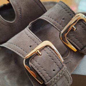 Suede Leather sandals in soft suede. Double, adjustable foot straps with metal buckles. Suede lining and molded insoles in suede. Worn just two times, sadly are a bit too big for me.