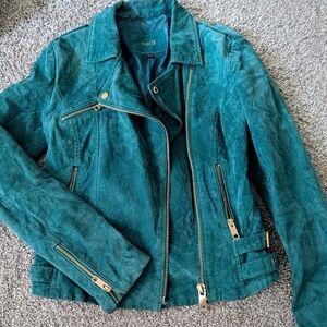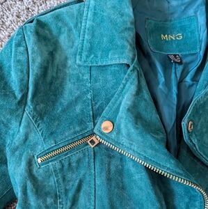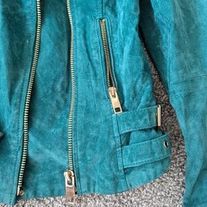 Stunning turquoise suede long sleeve jacket that has a full zipper and buckle detailing on the sides. It is in good condition, there is some fading on the shoulders and cuffs but otherwise good shape!