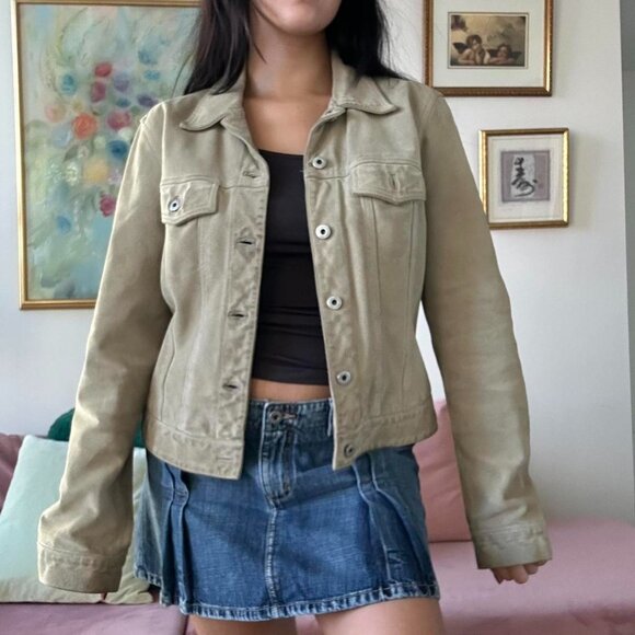 This stunning jacket is made with a yellow suede material and is vintage GAP.