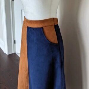 Suede asymmetrical colourblock camel/blue midi a-line skirt