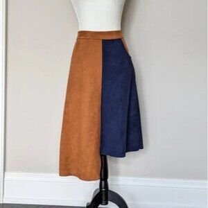 Suede asymmetrical colourblock camel/blue midi a-line skirt
