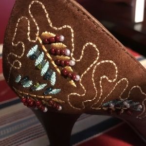 Chocolate brown suede Aldo pumps. Beautiful stitching and beading all the way around body of shoe. Almost never worn! Heels ~ 3 1/2 inches