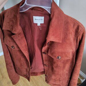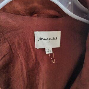 Suede jacket size 38, French company Maison 123, almost new.In the indoor photo the jacket looks brick brown, in the outdoor photo the jacket looks more reddish in color. Size EU38, chest 94 cm,waist 72cm,hip 95 cm. The last photo shows a similar model of the jacket in fit and length.