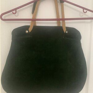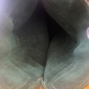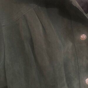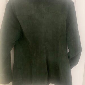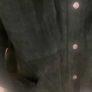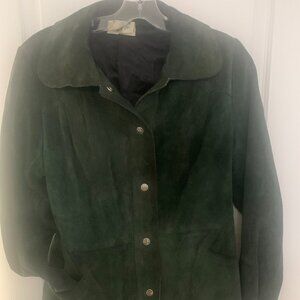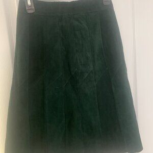 Forest Green Suede Suit. Waist is 28 inches, Length of skirt is 24 inches, 7 front buttons, skirt has 14 panels in fullness.