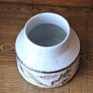 This lovely sugar bowl is in the "Wild Oats" pattern made by Midwinter Stonehenge, a division of Wedgwood Potteries in England made during the 1970's. The Wild Oats pattern features a grouping of brown heads of grain. The background is a cream color flecked with brown and edged with narrow bands of dark brown. It is a very earthy, soothing palette.
