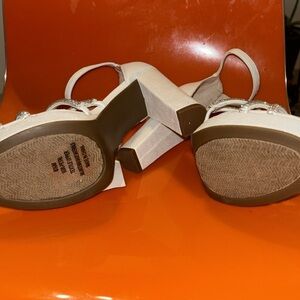 White and silver fancy shoes size 6 1/2 with tags never been worn however there is a slight stain on the top of one heel from being in storage I’m assuming, perfect for a wedding anniversary, prom like events. Straps are adjustable and the white shimmers beautifully.